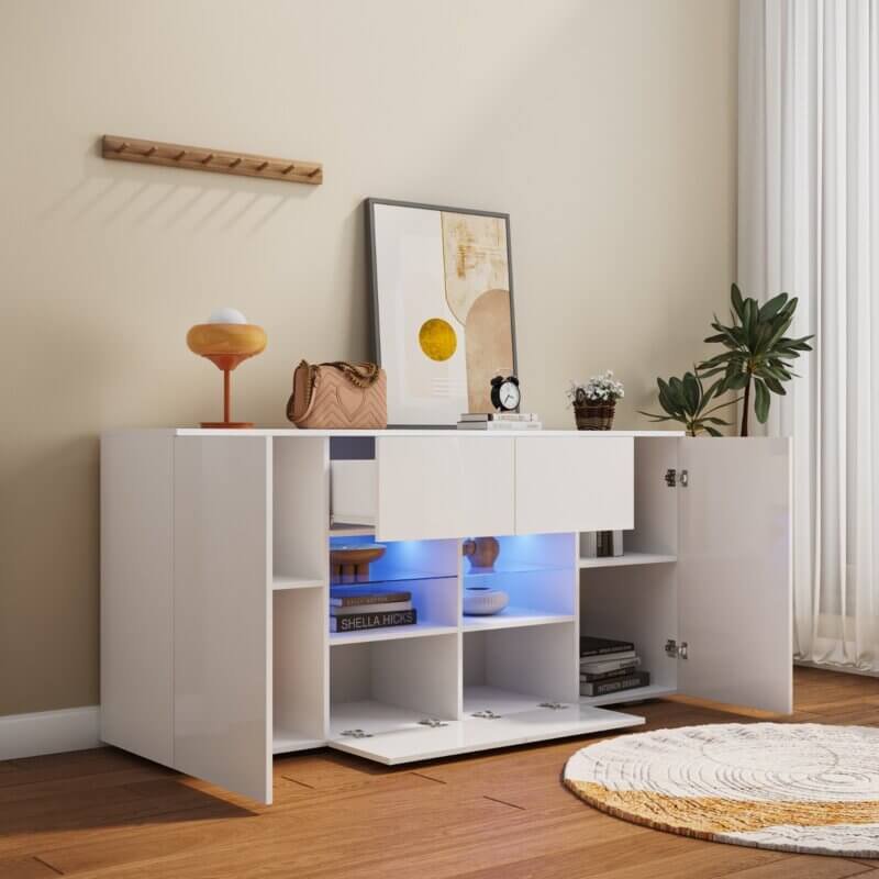 Grâce à sa finition blanche brillante, ce meuble illumine la pièce.