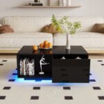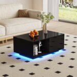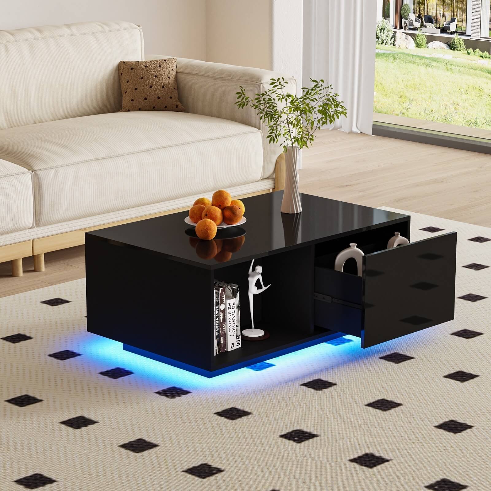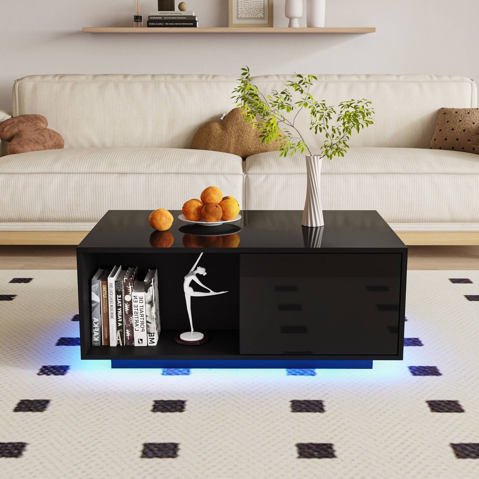 LIFEZEAL Table Basse LED  avec 1 Grand Tiroir et Compartiment, Télécommande et Prise USB, 95 x 55 x 31 cm, Noir