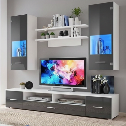 Tout d’abord, cet ensemble meuble TV avec façade en verre laqué apporte une élégance contemporaine au salon.