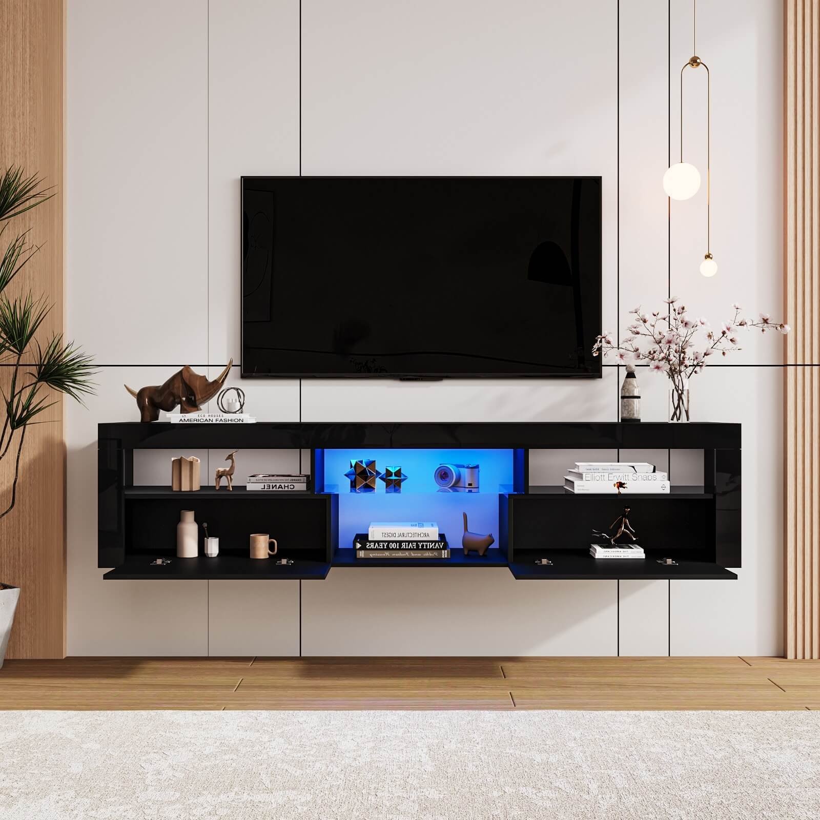 Avec sa finition noire brillante, ce meuble TV suspendu noir est plus moderne et plus élégant. Ce support TV flottant prend en charge les téléviseurs de 65 à 200cm.